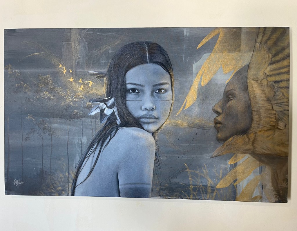 Entre suas obras expostas no ateliê, há uma que traz a figura de uma mulher indígena. Ela está na parede em que a cadeira de Odivan recosta, de maneira que consigo vê-la com riqueza de detalhes. A representação é tão real, que pairou em mim a certeza de ser Marcielle, personagem do filme Manas (2025), dirigido por Marianna Brennand. Quando perguntei quem era a moça, a resposta me surpreendeu: “É uma criação minha e é muito engraçado porque todo mundo que já veio aqui em casa e vê essa pintura, se reconhece. Uma moça disse que parecia a irmã dela, outra a comparou com uma cabocla. Mas assim, eu só desenho, vou pintando, aí me vêm algumas ideias e eu vou montando, vou tirando… às vezes chego até a descartar algumas criações, mas sempre fica alguma coisa assim”, explica movimentando o pescoço para olhar o quadro.