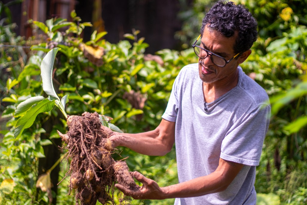Entre os cultivos do sítio, ele destaca o ariá, ingrediente tradicional da Amazônia que vem sendo perdido pelo baixo consumo, e o papel da gastronomia em resgatar esse alimento. “É parente da batata e algumas pessoas falam que lembra o milho, então é mais crocante. O ariá só vai começar a ganhar espaço quando cozinheiros como a Juliana usarem nas receitas. Algumas pessoas são muito tradicionais na hora de comer e tem dificuldade de experimentar algo novo”, observa.
